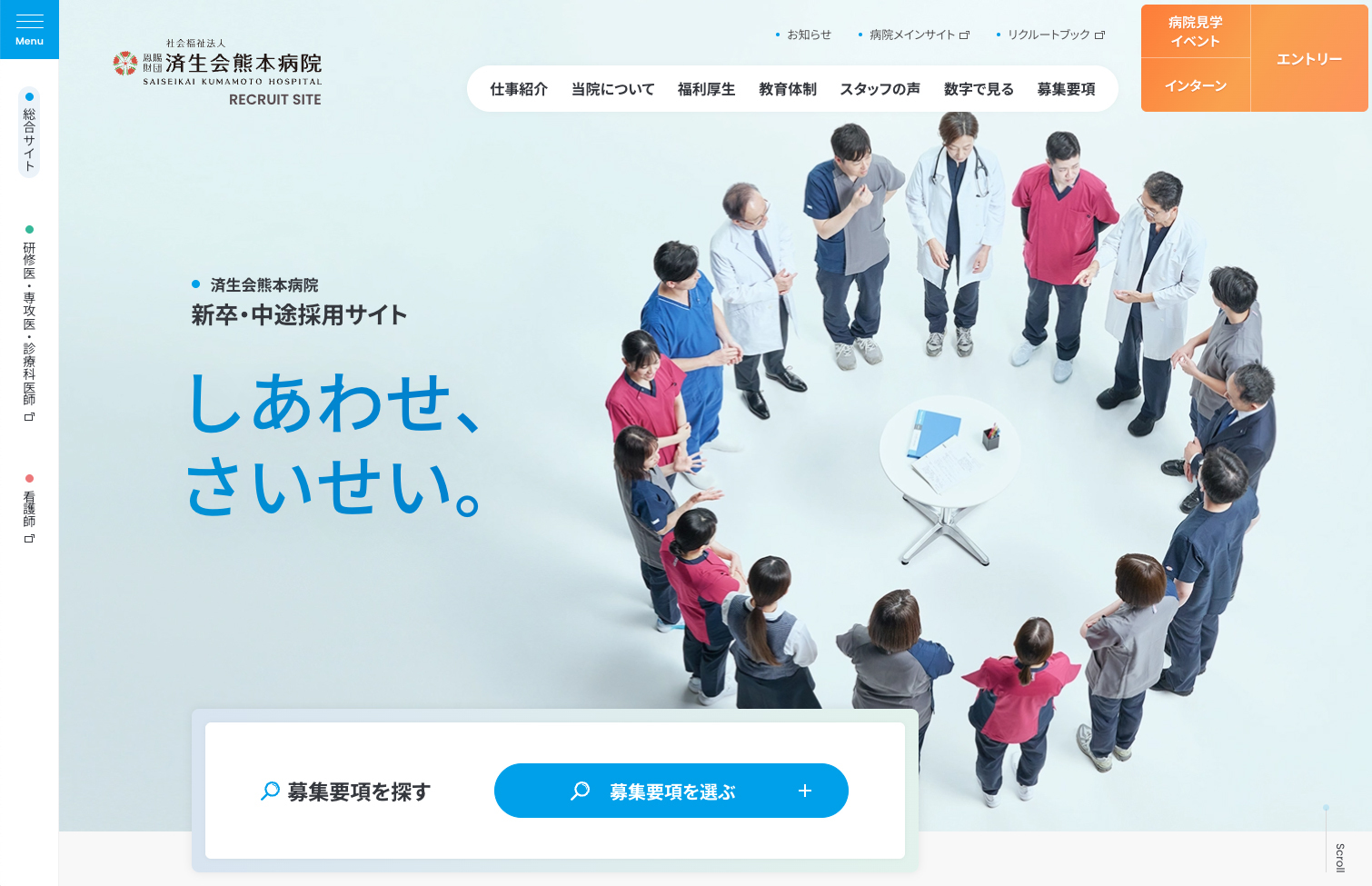 いつも済生会熊本病院の採用情報をご覧いただき、誠にありがとうございます。 この度、当院の魅力をより深く、より分かりやすくお伝えするために、採用サイトを全面的にリニューアルいたしました。 今回のリニューアルでは、デザインの一新はもちろん、働くスタッフの「声」や、私たちが大切にしている「ビジョン」をより具体的にイメージしていただけるようなコンテンツを拡充しております。 今後も、求職者の皆さんにとって有益な情報を発信してまいります。 新しくなった採用サイトを、ぜひご覧ください。