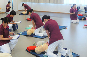 また、各部署単位のチーム支援型をとり、部署全体で新人看護職員の教育、指導を実施しています。様々な教育プログラムを行っており、技術的な内容だけでなく、安全管理などの管理的内容の研修も充実しています。