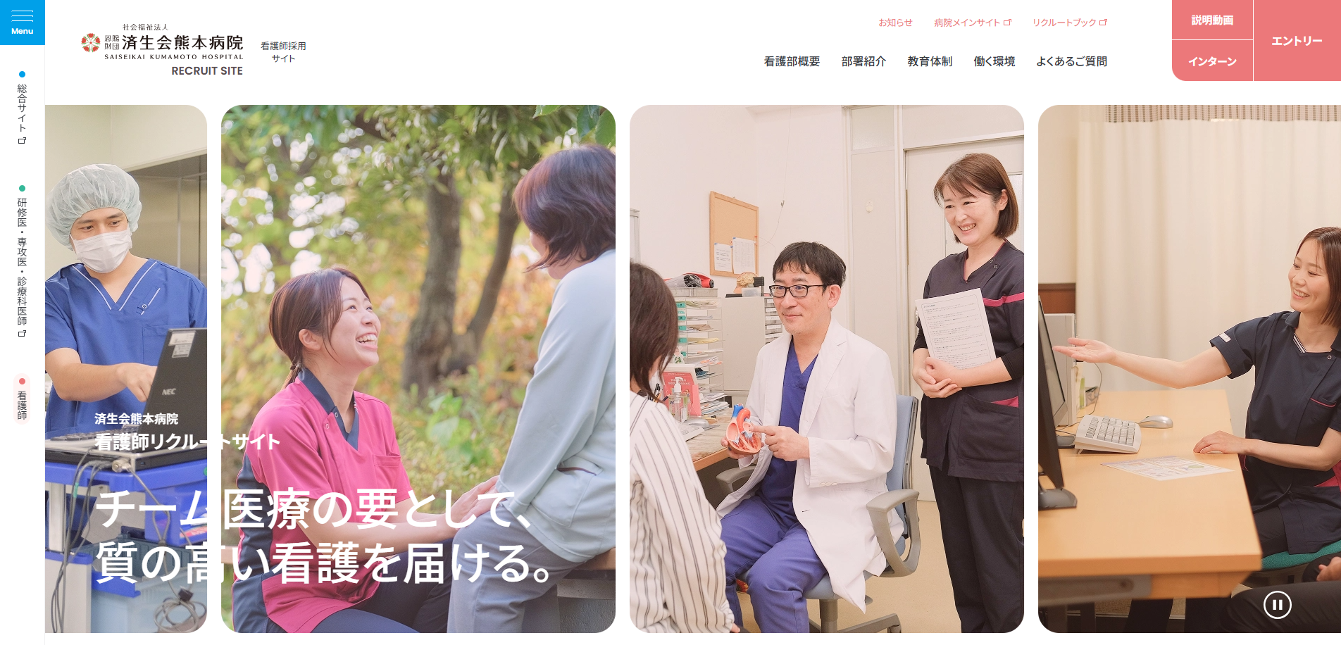 いつも済生会熊本病院の採用情報をご覧いただき、誠にありがとうございます。 この度、当院の魅力をより深く、より分かりやすくお伝えするために、採用サイトを全面的にリニューアルいたしました。 今回のリニューアルでは、デザインの一新はもちろん、働くスタッフの「声」や、私たちが大切にしている「ビジョン」をより具体的にイメージしていただけるようなコンテンツを拡充しております。 今後も、求職者の皆さんにとって有益な情報を発信してまいります。 新しくなった採用サイトを、ぜひご覧ください。
