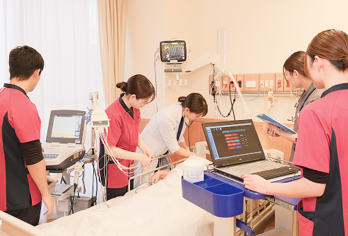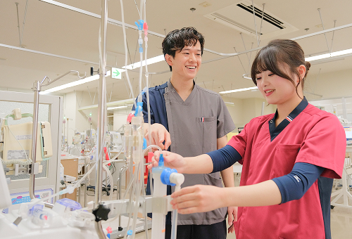 心臓血管外科手術などの過大侵襲術後や重症呼吸不全、ショックなどによる多臓器障害のある重症患者を受け入れています。ECMOやIMPELLAなどの最新医療機器や治療法の導入にも積極的に取り組み、高度先進医療を提供しています。合併症予防と早期回復を目指し、専門性の高い多職種チームが連携しながら患者・家族に寄り添った質の高い医療提供に努めています。看護師には段階的教育体制が整備されており、安心して知識・技術を習得できる環境が整っています。クリティカルケア・集中ケア認定看護師や特定看護師、集中治療認証看護師など専門性の高い看護師が活躍しており看護師教育にも積極的に関わっています。