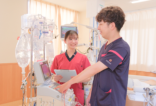 周術期のフィジカルアセスメントや症状緩和などの気づきの看護を行っています。腎臓内科は慢性腎不全、IgA腎症、ネフローゼなどの患者さんがおり血液透析・腹膜透析の導入期指導や継続的な治療へのサポートを行っています。私達は、患者のセルフケアを支援するため、生活背景や思いを汲み取り、医療チームの一員として調整力や倫理的感性を持って看護に取り組んでいます。