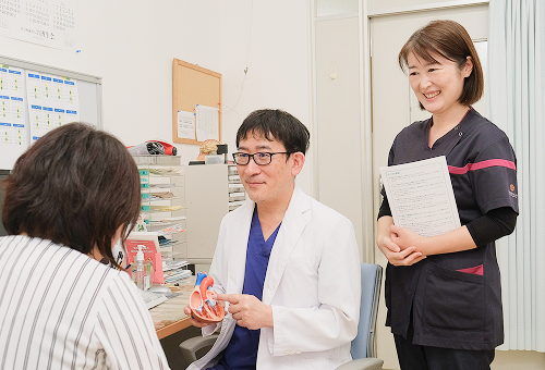 心疾患は退院後の自己管理が患者のQOLに影響するため、多職種による心不全チームでの包括的ケアや心臓リハビリテーションに力を入れ、心不全療養指導士を中心に患者さんの思いに寄り沿ったセルフケア支援を行っています。また、心臓リハビリテーション指導士や終末期ケア専門士など専門的な資格をもった看護師が活躍しています。