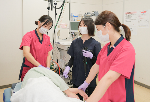 胃・大腸・肝臓・膵臓などの消化器系臓器に関する疾患の診断・治療を行う病棟です。特に、消化管出血や急性胆管炎など、内視鏡による緊急治療が必要な患者に対応するため、内視鏡技師資格を持つ看護師が在籍しており、医師と連携して24時間365日体制で緊急治療を実施しています。また、悪性腫瘍の患者も多く、意思決定支援や緩和ケア、終末期の退院支援に力を入れています。院内の多職種や地域の医療・福祉スタッフと連携しながら、一人ひとりに寄り添ったケアを提供しています。