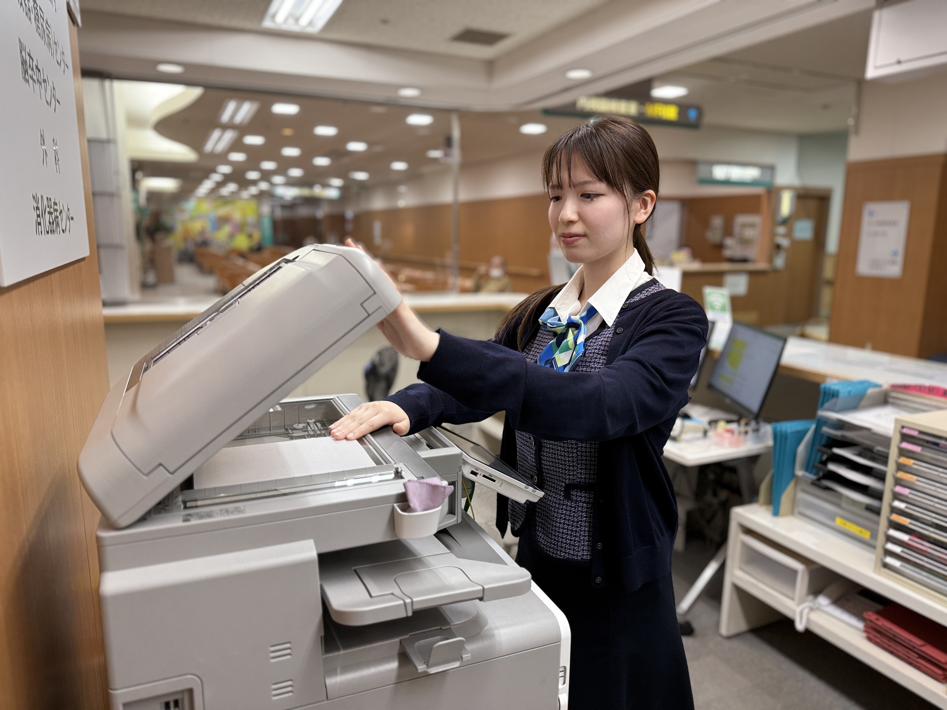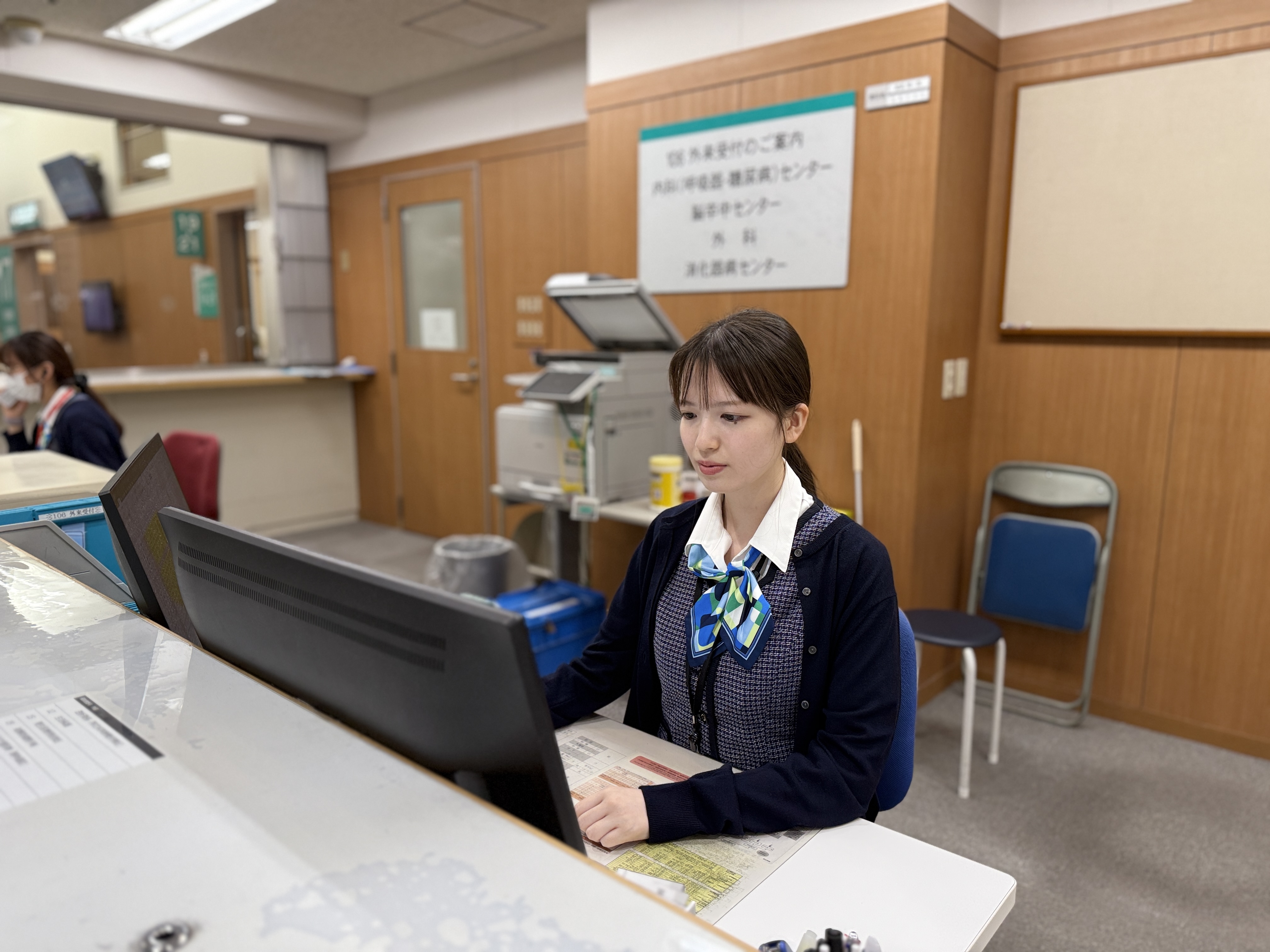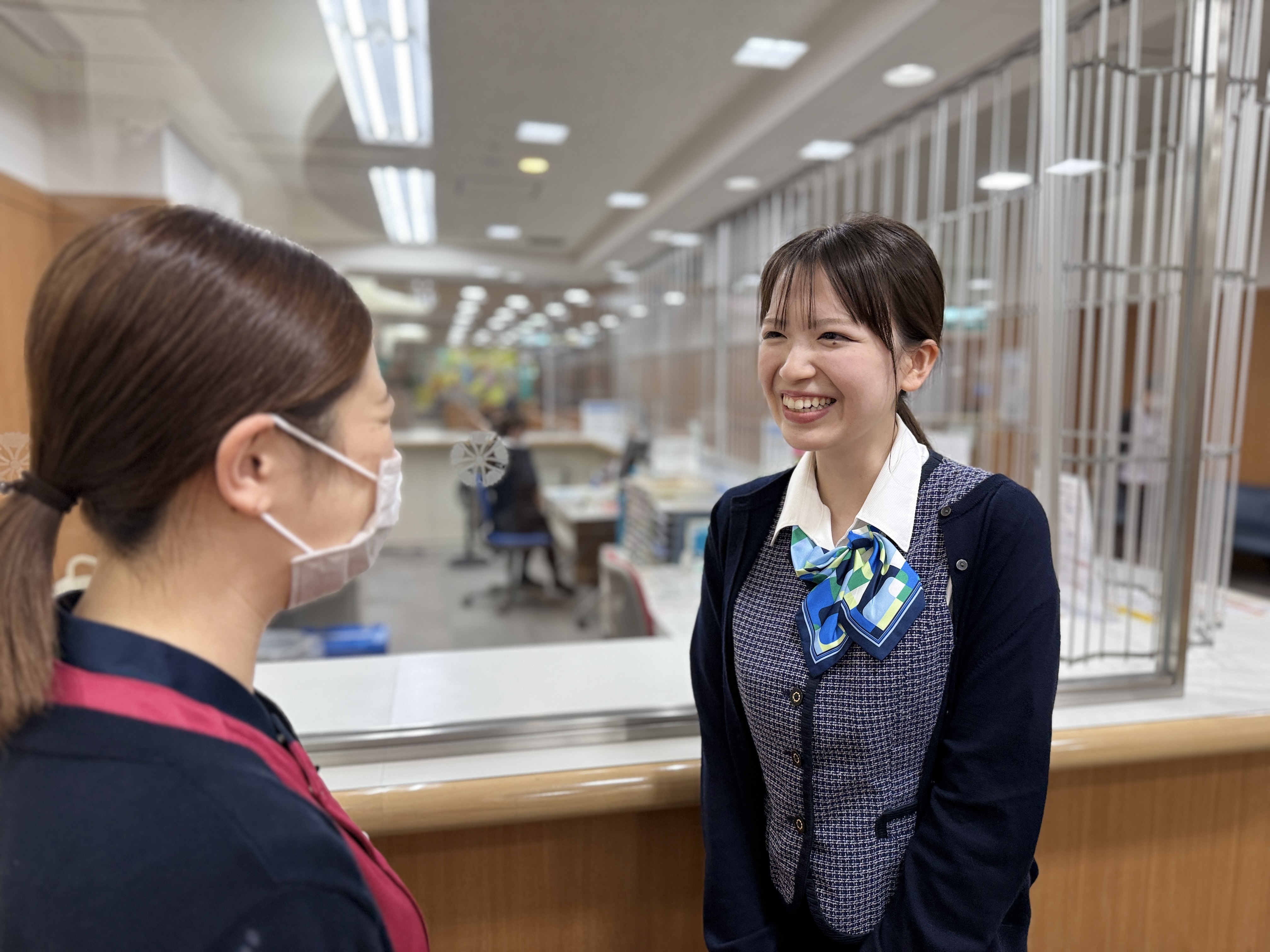 外来窓口や総合案内など、患者さんと接する機会の多い業務を担当しています。職員の方々の言葉遣いや配慮から学ぶことが多く、患者さんとの会話を通じて病院のことを深く知る機会にもなります。日々の業務の中で、患者さんの笑顔や温かい言葉に励まされ、前向きに取り組む力をもらっています。