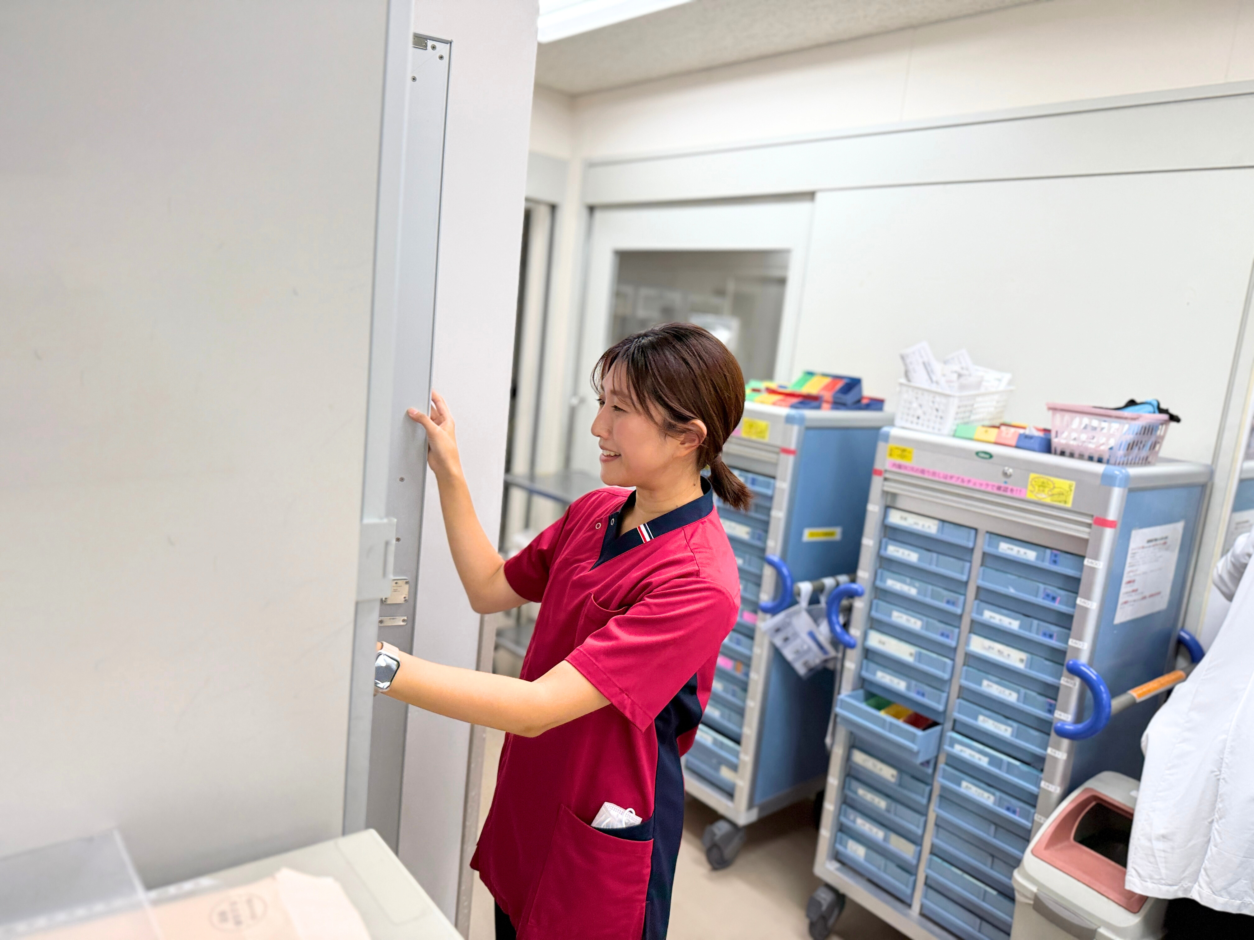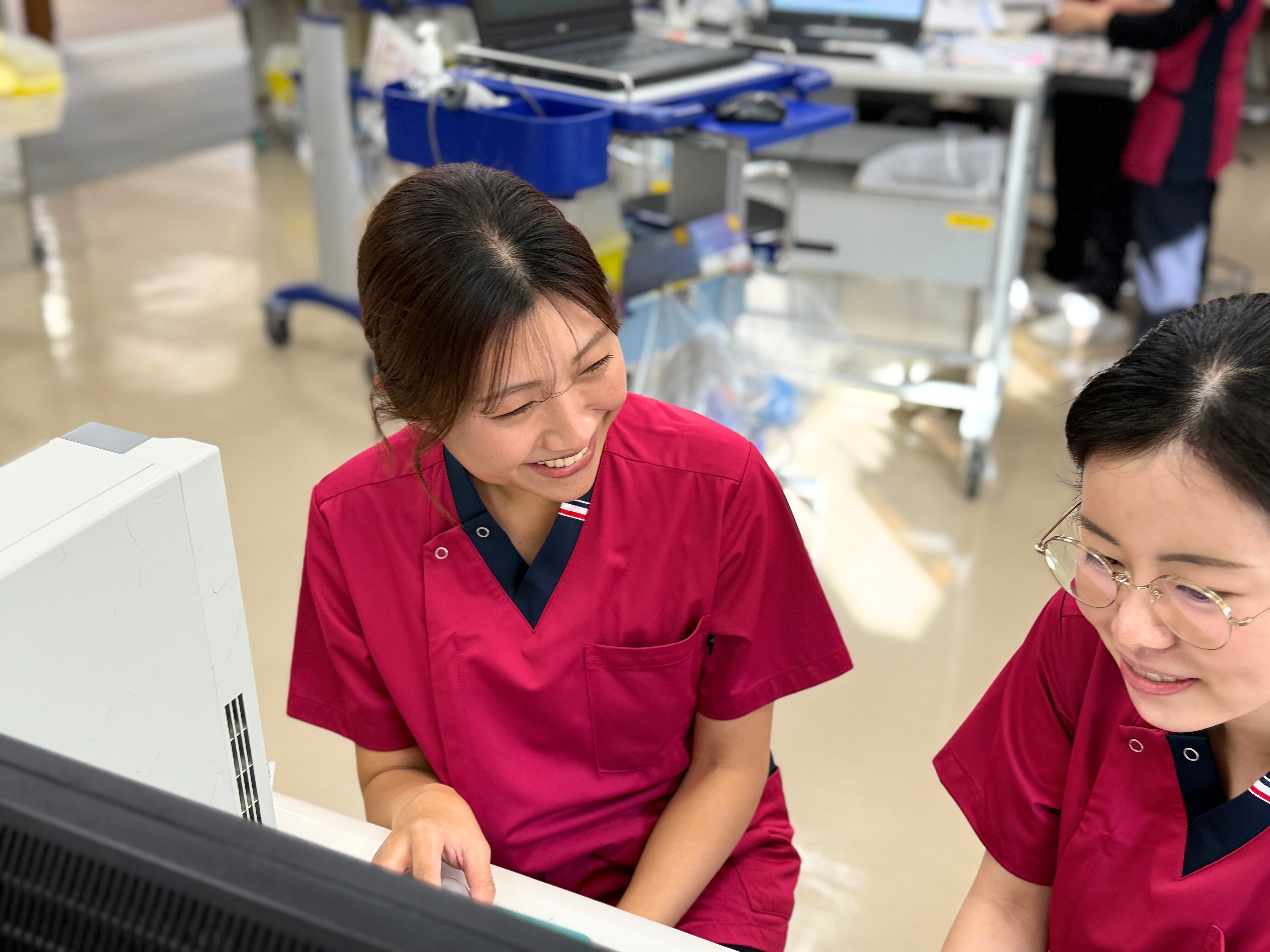 看護学生の頃に当院の3部署で臨地実習を経験しました。急性期病院であり、日々患者さんの病態が変化していく中で様々な面での看護師の役割を学び、忙しい中でも患者さんに寄り添う先輩看護師が憧れの存在となりました。また、学生であった私達へも日々丁寧に指導を頂き、インターシップでは新人看護師への整った教育体制も知る事ができ、当院を選びました。その頃は結婚し二児の母になるとは思っていませんでしたが、二児の母になった今仕事と家庭を両立しながら働くことができる環境にあることも当院の魅力であると感じています。