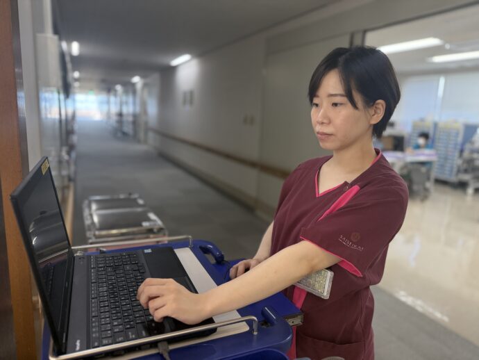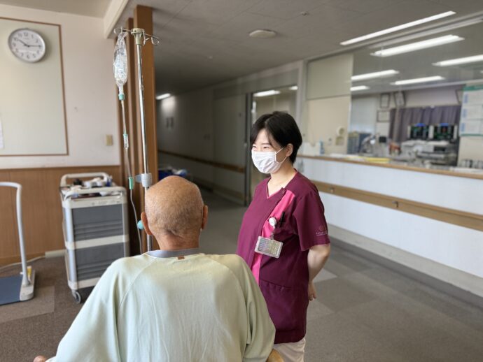 私の所属する6東病棟では、主に消化器外科の患者さんをはじめとする消化器系の患者さんが多く入院されています。病床数が多く入退院の回転が早いため日々の業務は忙しいですが、そのぶんスタッフ間のチームワークは強く、支え合いながら働ける環境だと感じています。また、癌を患う患者さんも多くいらっしゃるため、患者さんの身体的・精神的な苦痛を少しでも和らげられるよう、チーム医療を意識して関わっています。術後の患者さんが元気に退院されていく姿や、患者さん・ご家族からいただく感謝の言葉が大きな励みです。