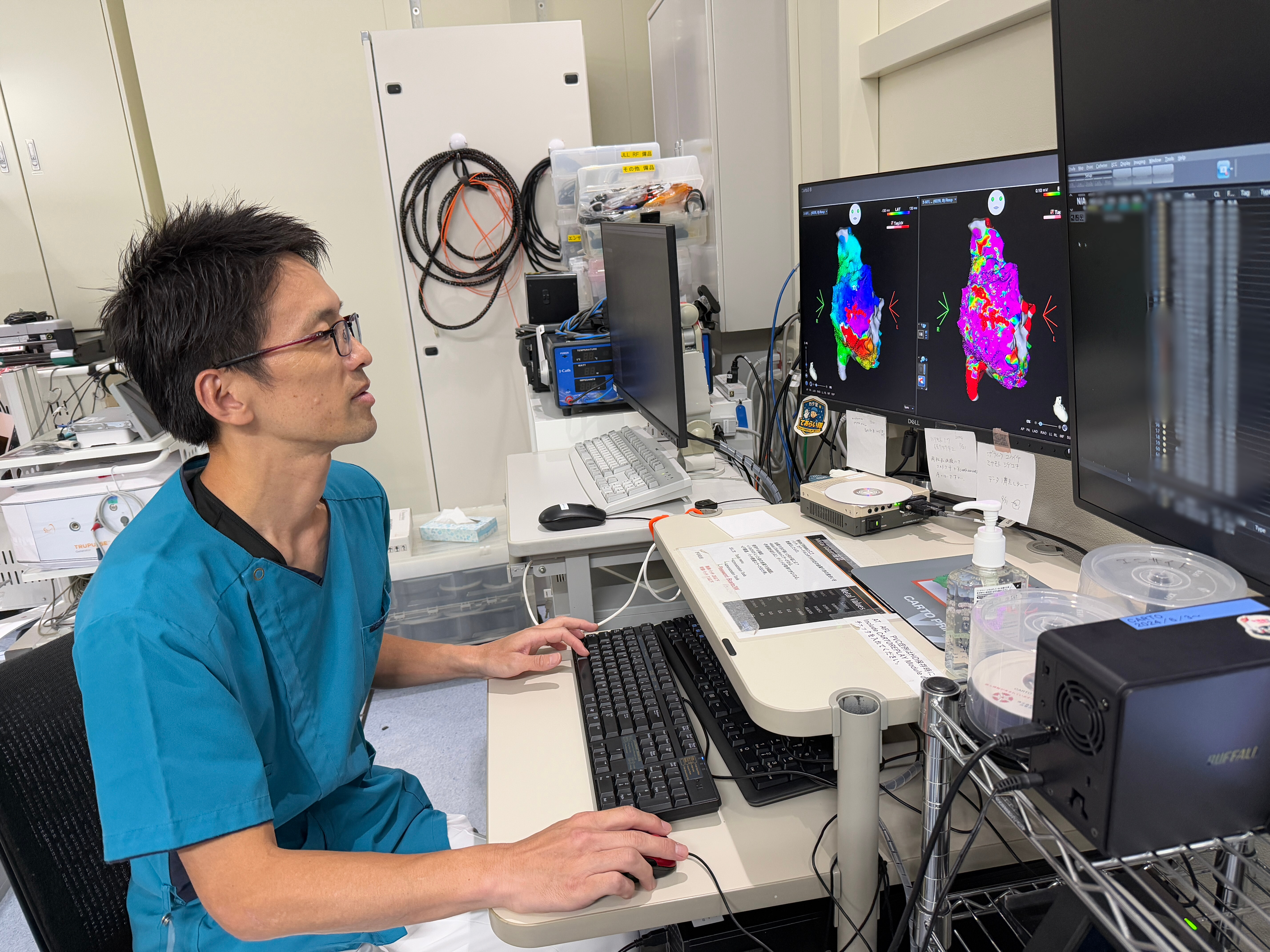 現在は血管造影室で、心血管領域の検査や治療に携わっています。虚血領域では、心臓カテーテル検査・治療の際にIVUSなどのイメージング機器や、Impella・ECMOといった補助循環装置の操作を担当しています。不整脈領域では、ペースメーカなどの植込み手術に立ち会い、ペースメーカフォローアップ時の検査や管理を行っています。また、アブレーション治療では3Dマッピングシステムを始め多様な機器を扱い、安全な治療を支えています。医療技術の進歩に伴い、装置のアップデートや新規技術導入も多く、常に情報とスキルの更新が求められます。装置の性能を最大限に引き出し、診療に貢献できることが大きなやりがいです。