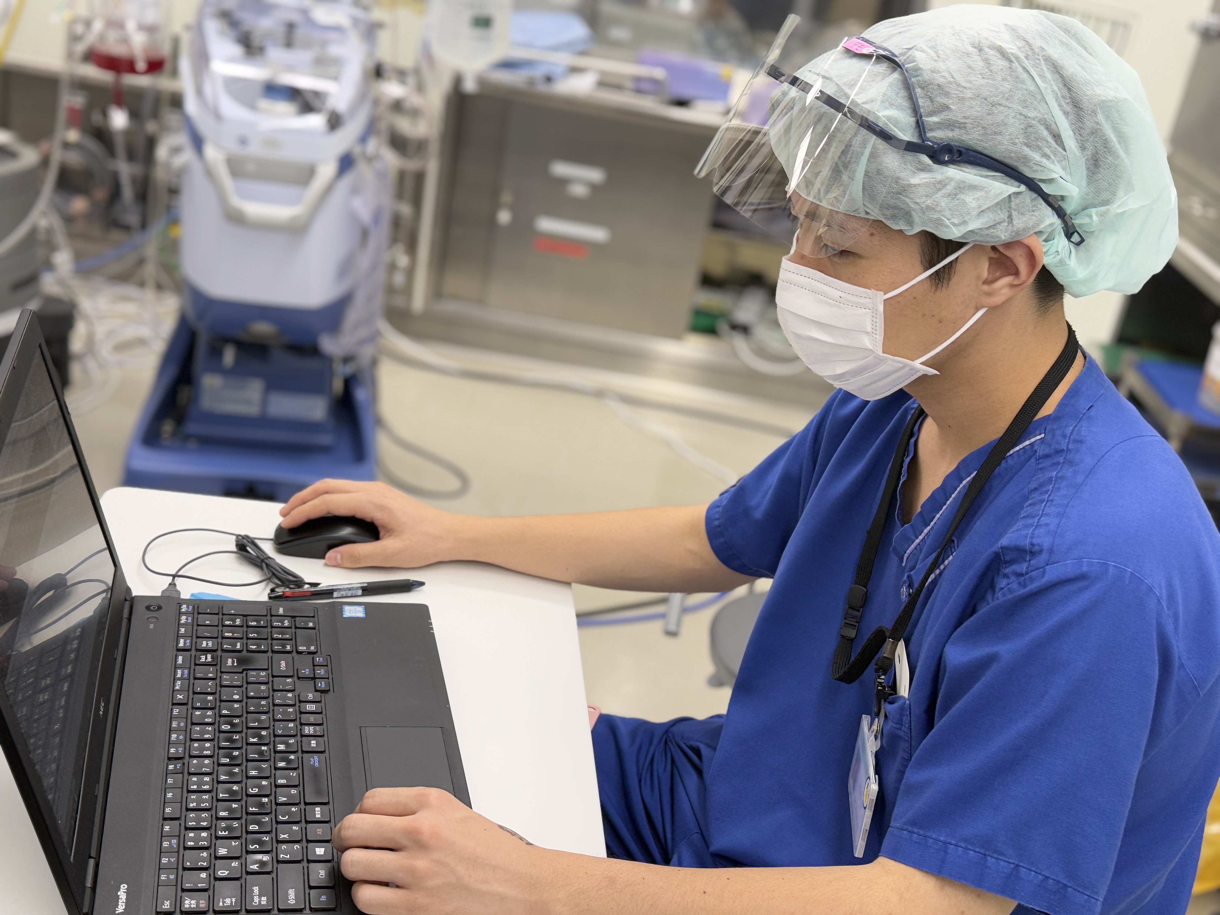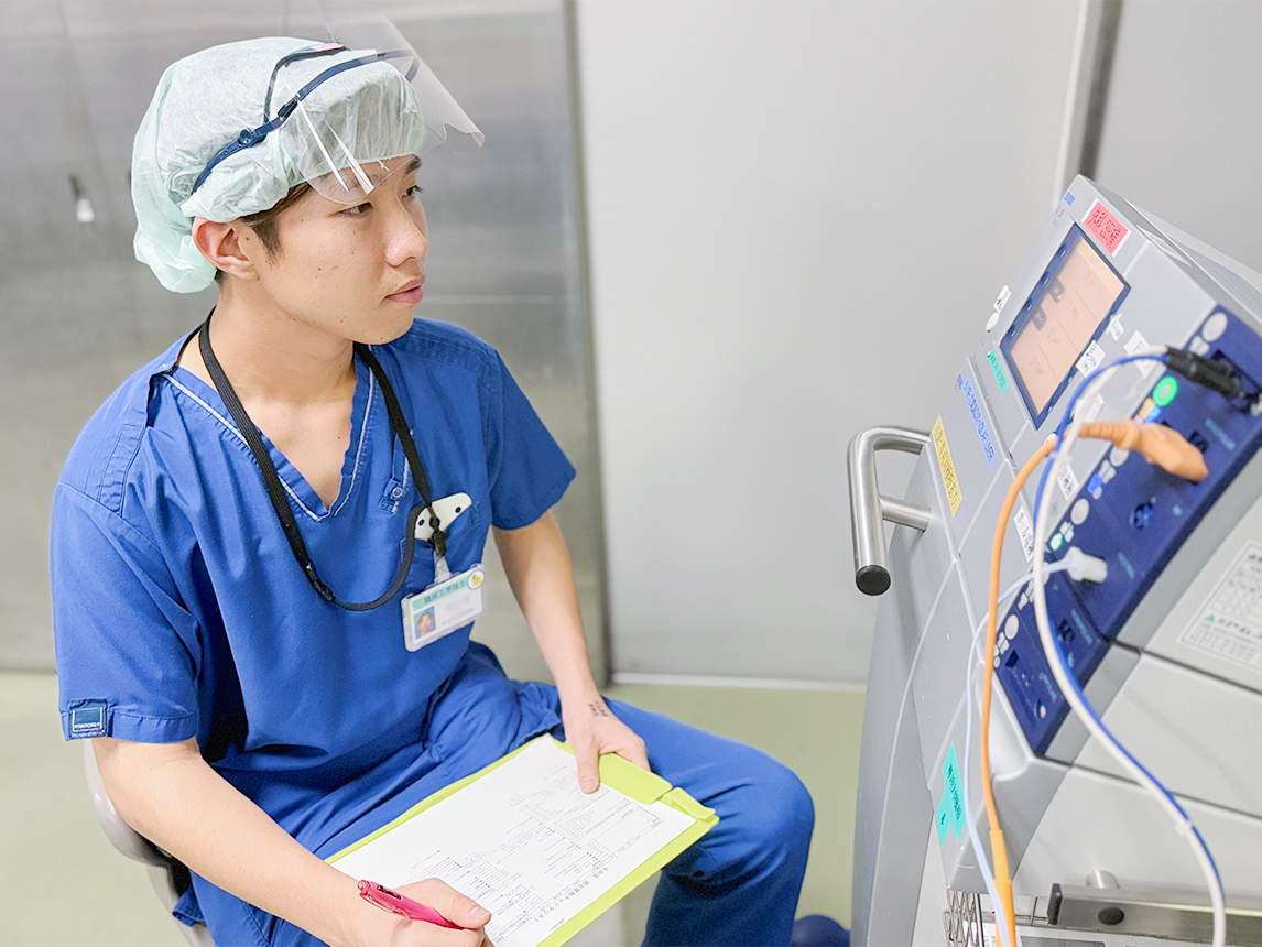 中央手術部で、人工心肺業務の記録や心筋保護装置・自己血回収装置の操作、手術支援ロボットdaVinci業務、スコープオペレーター業務など行っています。また1週間に一度、ME機器管理業務も研修しています。なかでも心臓手術での心筋保護液の投与を担当していますが、患者さんそれぞれに適切な心筋保護液の温度、注入速度、注入圧があり、これらを正確に投与しないと、手術の遂行に大きな影響を及ぼします。このように命に直接関与する人工心肺業務は責任も重くなりますが、その分やりがいを感じています。
