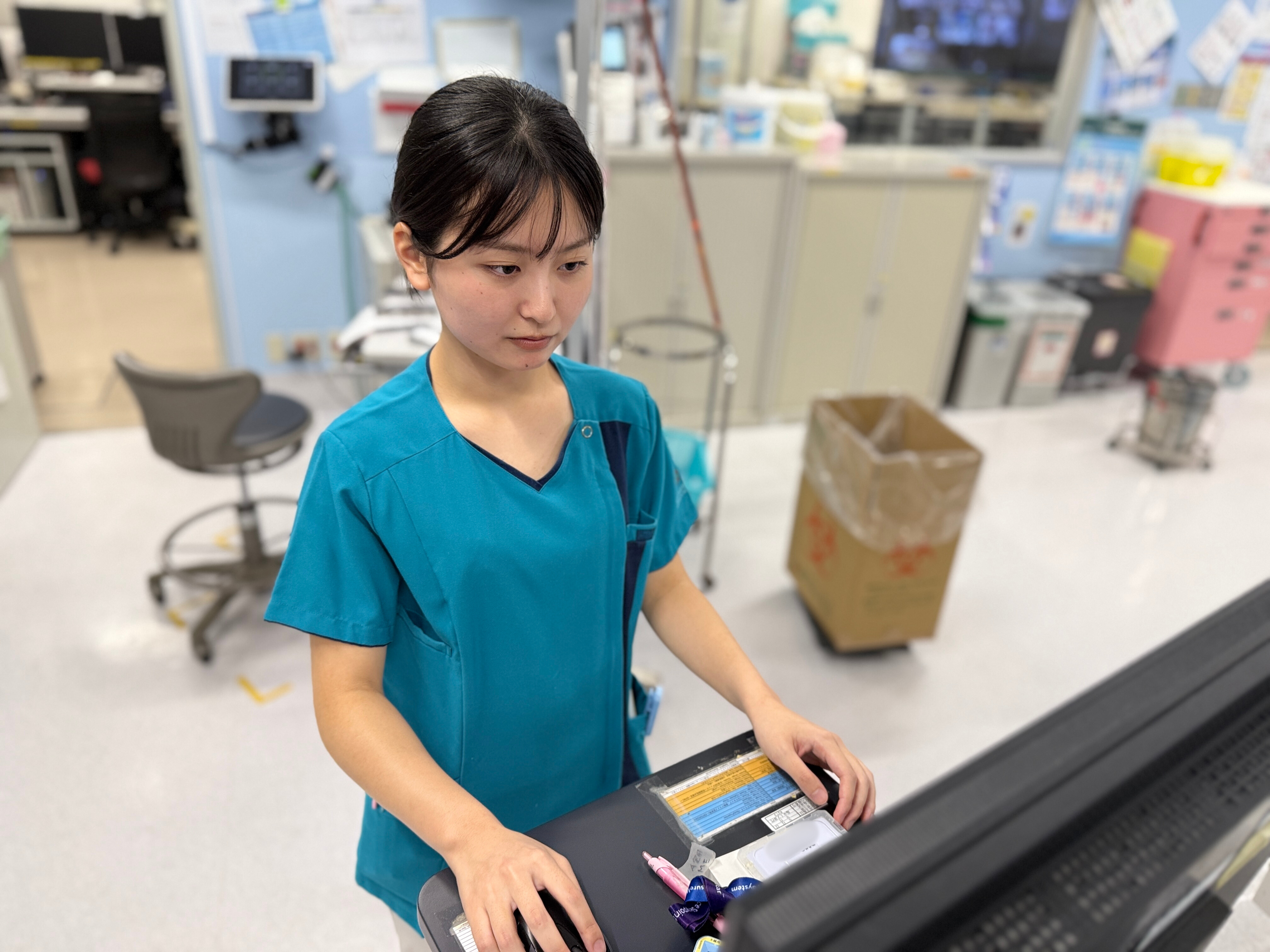 カテーテル治療業務に携わっています。主な仕事内容は、心電図パッチ貼り付け、血圧計装着、ポリグラフ、IVUSなどの医療機器の操作を行っています。日々、新しい業務に携わる中で、先輩方のご指導のもと、一つ一つの仕事を確実に覚えていくことに全力の毎日を送っています。カテーテル治療業務では命に直結する業務でもあるため常に責任感を持って取り組んでいます。その一方で、自分の技術や判断が治療に貢献できたときは大きなやりがいを感じます。