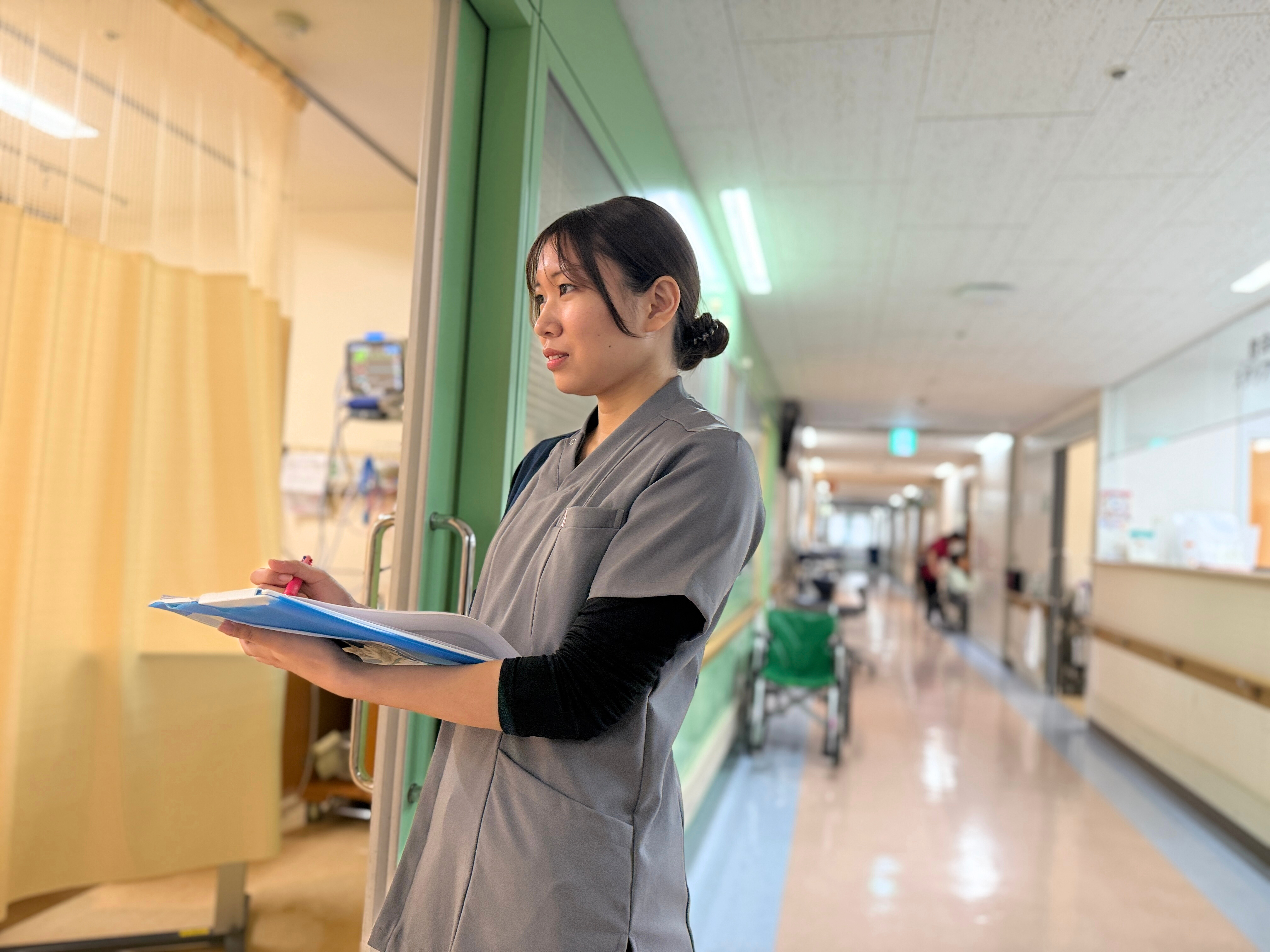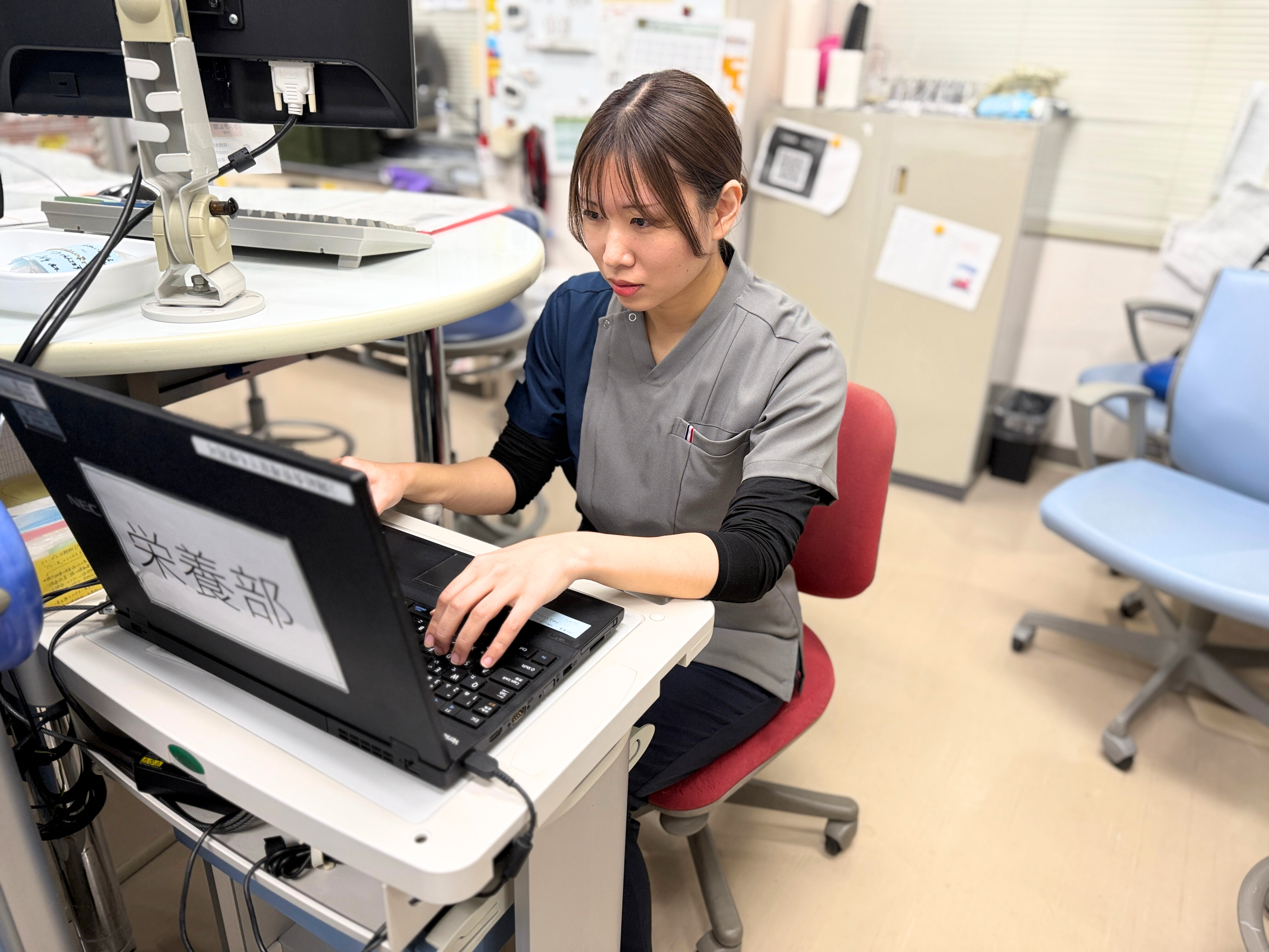 管理栄養士という職種は病院だけでなく、学校や福祉施設、企業など様々な活躍の場がありますが、私は元々医療現場で働くこととチーム医療の一員として働く管理栄養士に憧れがあり、就職先として病院を選びました。その中でも患者さんや他職種のスタッフとより近い距離でコミュニケーションをとりながら栄養管理が出来る栄養士の病棟常駐を先進的に進めている当院に強い魅力を感じ、入職を決めました。入職した現在、様々な職種の方から日々刺激を受けながら業務を行っています。