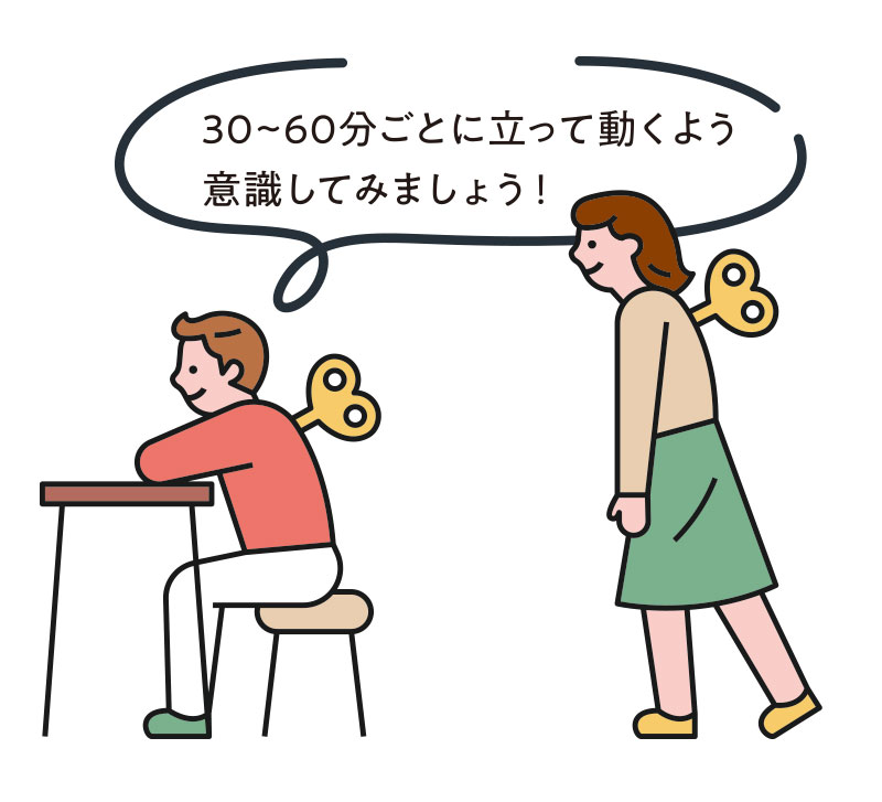 座位行動による健康トラブルを防ぐためには、なるべく頻繁に立ち上がったり歩いたりすることが大切です。普段の生活の中で意識して一定時間ごとに体を動かしたり、歩数を増やしたりしてみましょう!