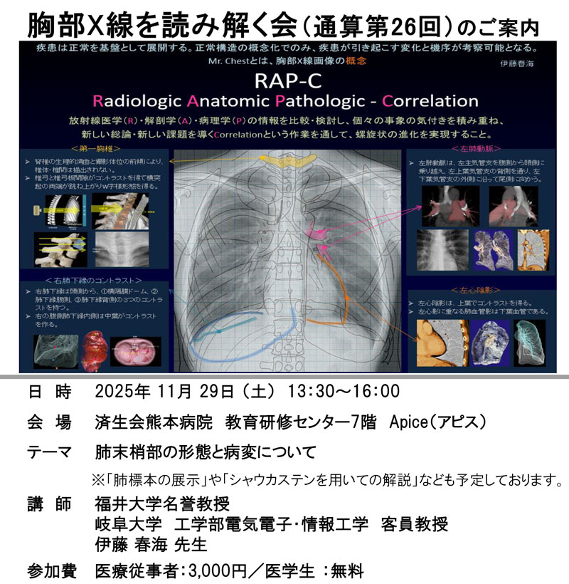 当会は、伊藤 春海先生(福井大学名誉教授、岐阜大学 工学部電気電子・情報工学 客員教授)を講師にお招きし、胸部X線読影の基礎を学ぶことを目的として開催し、全ての医療従事者、医学生・学生を対象としています。